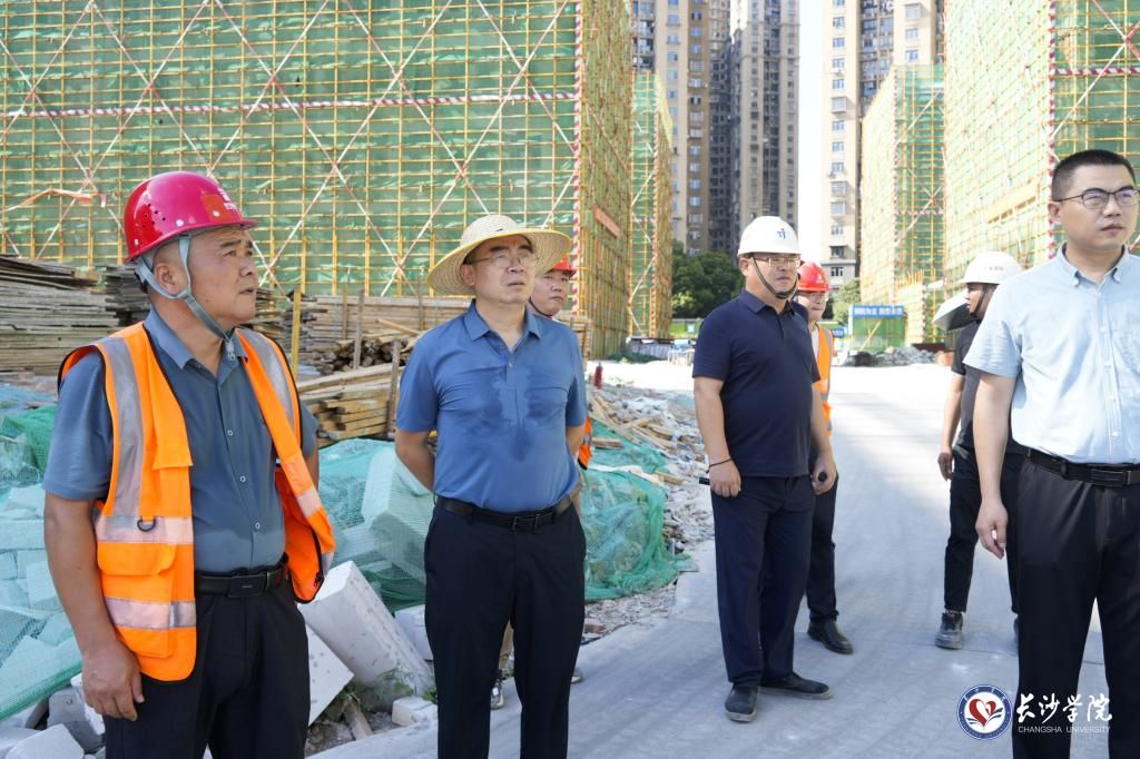(何利华一行在校东区学生宿舍建设项目施工现场)