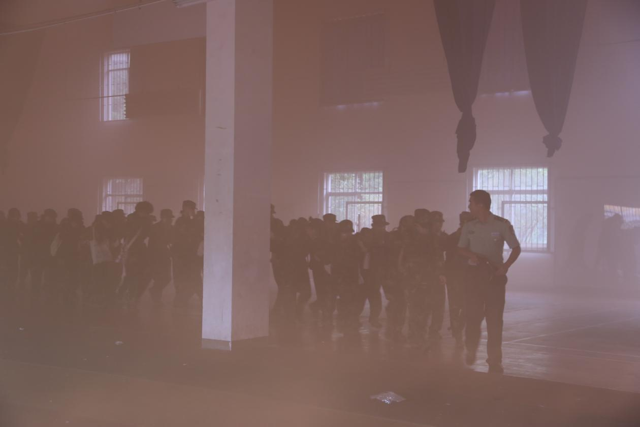 上午9点,随着消防警报响起,场地内浓烟四起,4300多名同学按照“捂鼻、弯腰、靠墙走”的七字逃生要领,口捂湿毛巾,依次弓身通过烟雾弥漫的羽毛球馆,在安全员的引导下,根据疏散标志指引,全部顺利疏散。